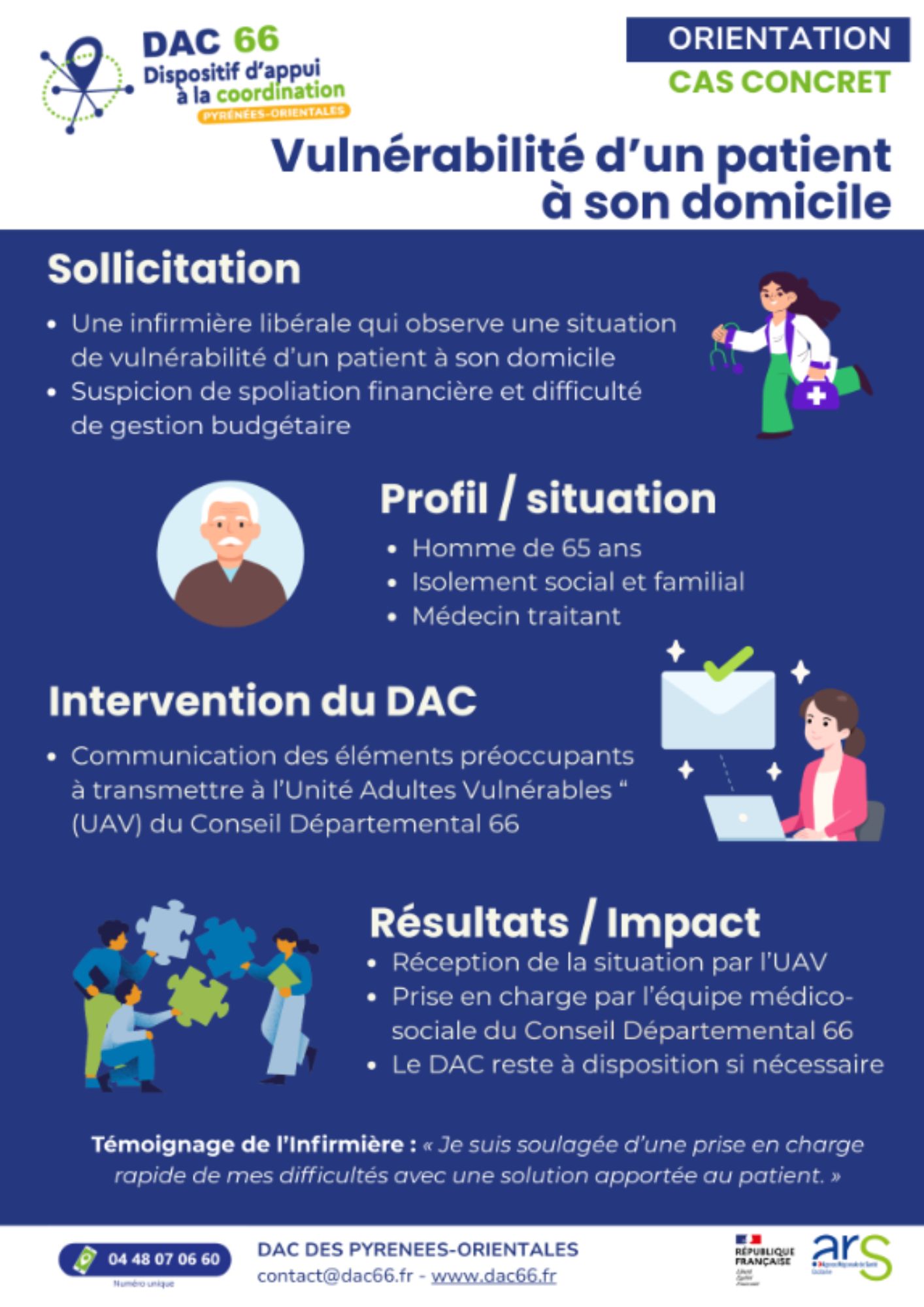 Exemples d'informations données par le DAC 66 Voir la fiche Exemple d'une demande d’orientation par une infirmière libérale (IDEL)Voir la fiche Exemple d'une demande d’orientation par un éducateur spécialiséVoir la fiche