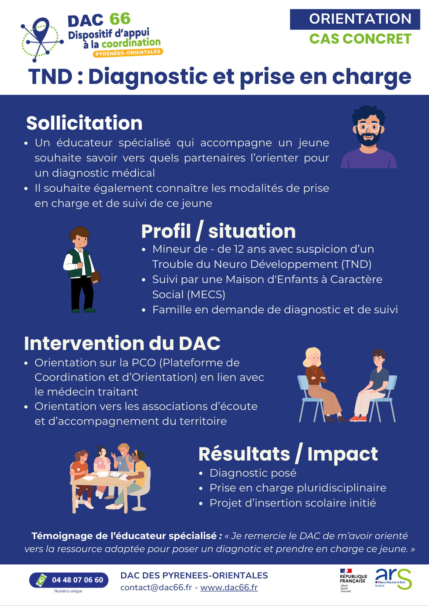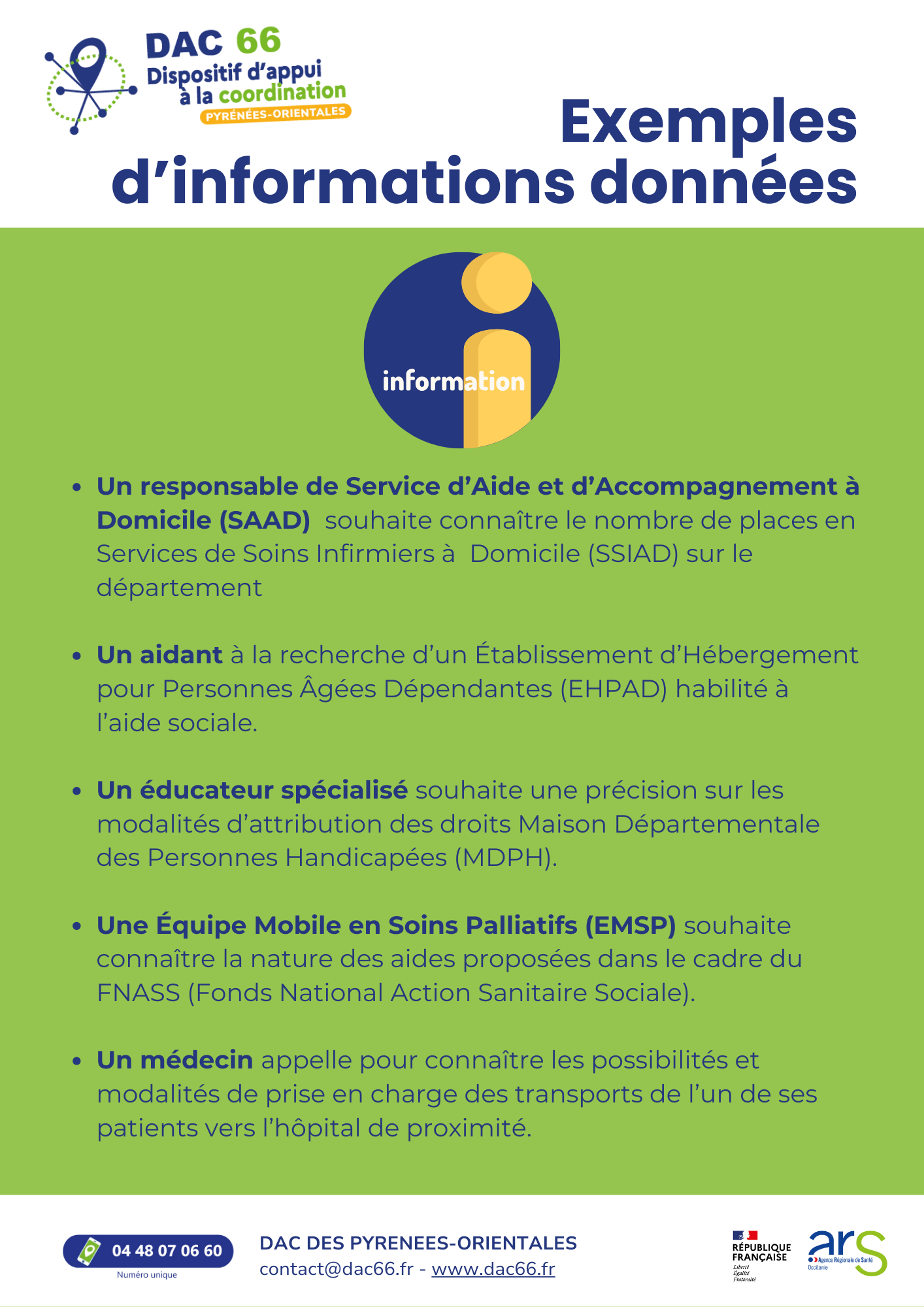 Exemples d'informations données par le DAC : Cliquez-ici Exemple d'une demande d’orientation par une infirmière libérale (IDEL)Cliquez-ici Exemple d'une demande d’orientation par un éducateur spécialiséCliquez-ici